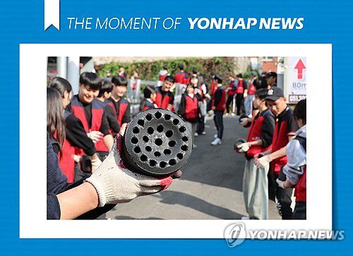 (부산=연합뉴스) 강선배 기자 = 4일 오후 부산 사상구 괘법동 괘내마을에서 경남정보대학교 교직원, 학생 및 외국인 유학생으로 구성된 봉사단 100여 명이 줄지어 저소득 가정에 연탄을 배달하고 있다. 학교 측은 이날 연탄 2,100장을 이 지역 저소득 가정 10가구에 전달했다. 2025.11.4 [THE MOMENT OF YONHAPNEWS] sbkang@