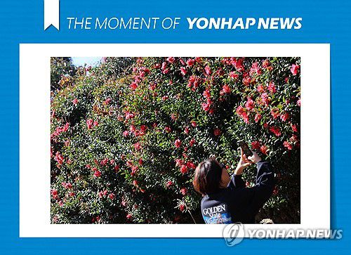(서귀포=연합뉴스) 박지호 기자 = 12일 오전 제주 서귀포시 안덕면 광평리의 한 담장 옆에서 한 시민이 활짝 핀 동백꽃을 휴대전화 카메라로 찍고 있다. 2025.12.12 [THE MOMENT OF YONHAPNEWS] jihopark@yna.co.kr ▶제보는 카카오톡 okjebo ▶연합뉴스 앱 지금 바로 다운받기~ ▶네이버 연합뉴스 채널 구독하기 <저
