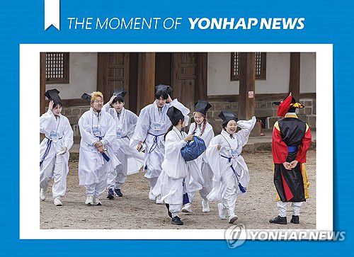 (서울=연합뉴스) 황광모 기자 = 16일 서울 종로구 성균관 명륜당에서 성균관대학교 신입생들이 조선시대 성균관에 입학한 유생들의 신입생 환영회인 신방례(新榜禮)에 참석해 선배들과 친목을 다지는 소신방례(小新榜禮)를 위해 준비한 다과 보따리를 들고 이동하고 있다. 2025.3.16 [THE MOMENT OF YONHAPNEWS] hkmpooh@yna.co.k