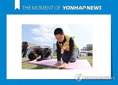 (서울=연합뉴스) 서명곤 기자 = 28일 서울 광화문광장에서 민주노총 서비스연맹 마트산업노동조합이 연 홈플러스 사태 해결을 위한 단식 선포 기자회견에서 참가자들이 108배를 하고 있다. 2025.4.28 [THE MOMENT OF YONHAPNEWS] seephoto@yna.co.kr ▶제보는 카카오톡 okjebo ▶연합뉴스 앱 지금 바로 다운받기~ ▶네이