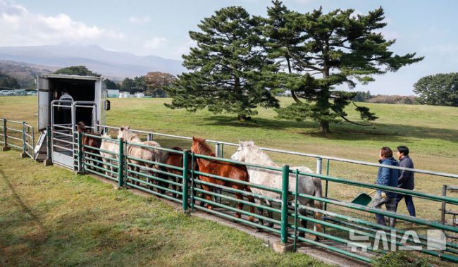[제주=뉴시스] 우장호 기자 = 절기 '입동'인 7일 오전 제주시 용강동 마(馬) 방목지에서 제주도 축산생명연구원 관계자들이 천연기념물 제347호 제주마의 월동 준비를 하고 있다. 축산생명연구원은 옛 고수목마(古藪牧馬) 재현을 위해 매년 봄부터 제주마를 5·16 도로변 방목지에 풀어 관리하다 겨울이 되면 연구원 내 방목지로 옮긴다. 2025.11.07. w