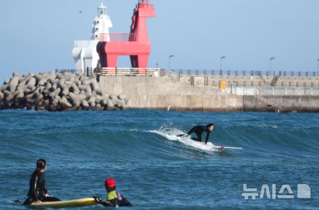 [뉴시스 앵글]모처럼 맑음…제주 바다서 즐기는 서핑