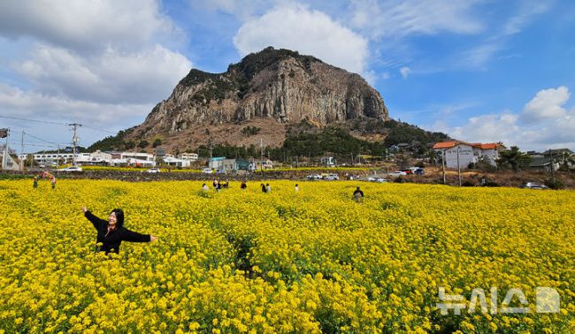 [서귀포=뉴시스] 우장호 기자 = 꽃샘추위가 찾아온 8일 오전 제주 서귀포시 안덕면 산방산 인근에 봄의 전령 유채꽃이 활짝 펴 상춘객들의 시선을 사로 잡고 있다. 2026.03.08. woo1223@newsis.com [제주=뉴시스] 우장호 기자 = 이틀째 꽃샘추위가 찾아온 8일 오전 제주 서귀포시 안덕면 산방산 인근에는 봄의 전령 유채꽃이 활짝 피어나 상