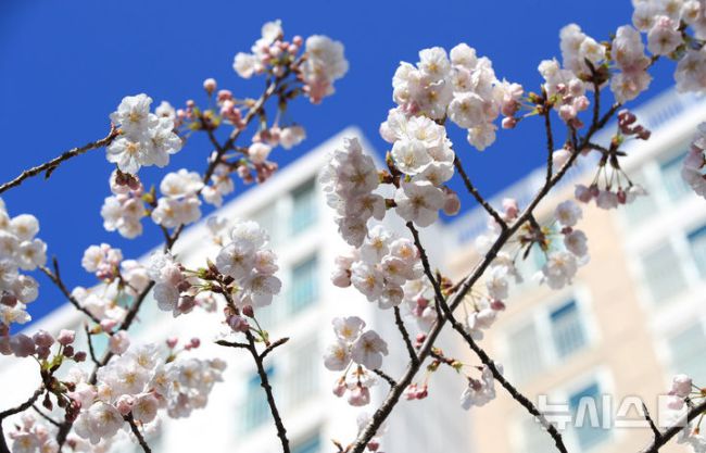 [제주=뉴시스] 우장호 기자 = 화창한 봄날씨를 보인 23일 오전 제주시 애월읍의 한 아파트 단지 내에 벚꽃이 활짝 피어나 시선을 사로 잡고 있다. 2026.03.23. woo1223@newsis.com [제주=뉴시스] 우장호 기자 = 화창한 봄날씨를 보인 23일 오전 제주시 애월읍의 한 아파트 단지 내에 벚꽃이 피어나 지나는 이들의 시선을 사로잡았다. 기