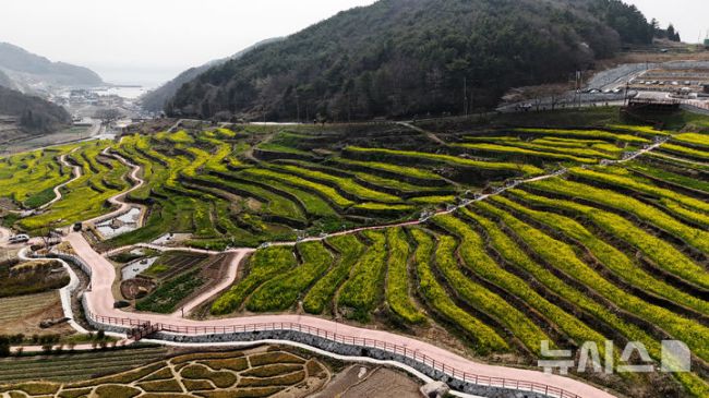 [남해=뉴시스] 차용현 기자 = 27일 오후 경남 남해군 상주면 두모마을 인근에 조성된 '파라다랑스' 꽃별테마공원 내 층층이 쌓인 계단식 논에 유채꽃이 흐드러지게 피어 상춘객을 유혹하고 있다. 2026.03.27. con@newsis.com [남해=뉴시스] 차용현 기자 = 경남 남해군 상주면 두모마을 인근 '파라다랑스' 꽃별테마공원 내 계단식 논에 유채꽃이