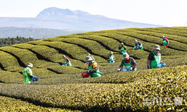 [서귀포=뉴시스] 우장호 기자 = 8일 오전 제주 서귀포시 도순동 돌송이차밭에서 지역민들이 해차를 수확하고 있다.해차는 24절기 중 다섯 번째 절기인 '청명' 이후 맑은 날만 골라 새순을 하나하나 채엽하여 만든다. 2025.04.08. woo1223@newsis.com [제주=뉴시스] 우장호 기자 = 8일 오전 제주 서귀포시 도순동 돌송이차밭에서 지역민들이