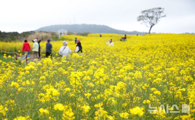 [서귀포=뉴시스] 우장호 기자 = 구름이 많이 낀 18일 오후 제주 서귀포시 안덕면 신화월드 내 신화가든을 찾은 관광객들이 유채꽃 사이에서 늦봄 정취를 즐기고 있다. 2025.04.18. woo1223@newsis.com [제주=뉴시스] 우장호 기자 = 구름이 많이 낀 18일 오후 제주 서귀포시 안덕면 신화월드 내 신화가든을 찾은 관광객들이 유채꽃 사이에서