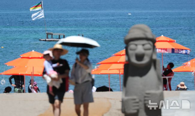 [제주=뉴시스] 우장호 기자 = 제주 북부지역에 올해 첫 폭염특보가 내려진 29일 제주시 이호테우해수욕장에 피서객의 발걸음이 이어지고 있다. 기상청에 따르면 당분간 폭염특보가 발표된 제주도북부, 동부, 중산간을 중심으로 뜨겁고 습한 남풍류가 유입돼 무더운 날씨가 이어질 것으로 전망된다. 2025.06.29. woo1223@newsis.com [제주=뉴시스]