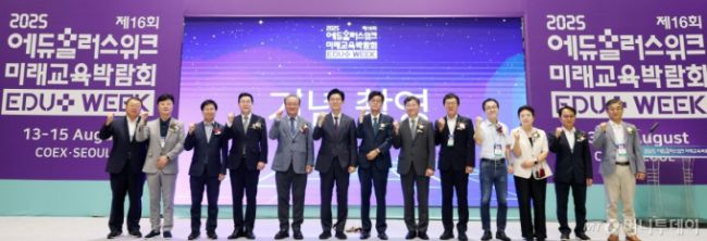 강호병 머니투데이 대표(왼쪽 다섯번째)를 비롯한 내빈 및 관계자들이 13일 서울 강남구 삼성동 코엑스에서 열린 '제16회 2025 에듀플러스위크 미래교육박람회' 개막식에서 기념촬영을 하고 있다. '2025 에듀플러스위크 미래교육박람회'는 한국과 미국, 영국, 폴란드, 싱가포르 등 15개국 170여 교육기업·기관·단체가 참여해 2000여 교육솔루션을 전시하며
