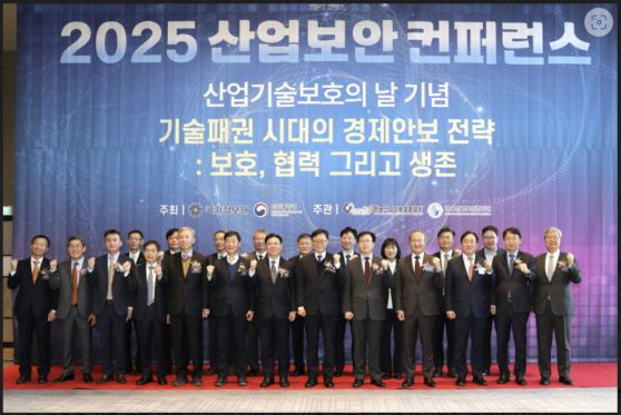 목성호 지식재산처 차장(앞줄 왼쪽에서 7번째)이 18일 서울 강남구 그랜드 인터컨티넨탈 서울 파르나스에서 열린 '2025 산업보안 컨퍼런스'에 참석했다. 국가정보원과 산업통상부가 주최한 이번 행사에서는 '기술패권 시대의 경제안보 전략: 보호, 협력 그리고 생존'이라는 주제로 글로벌 기술 유출 대응 방안 및 첨단 보안기술 공유를 통해 산업보안 정책이 나아가야