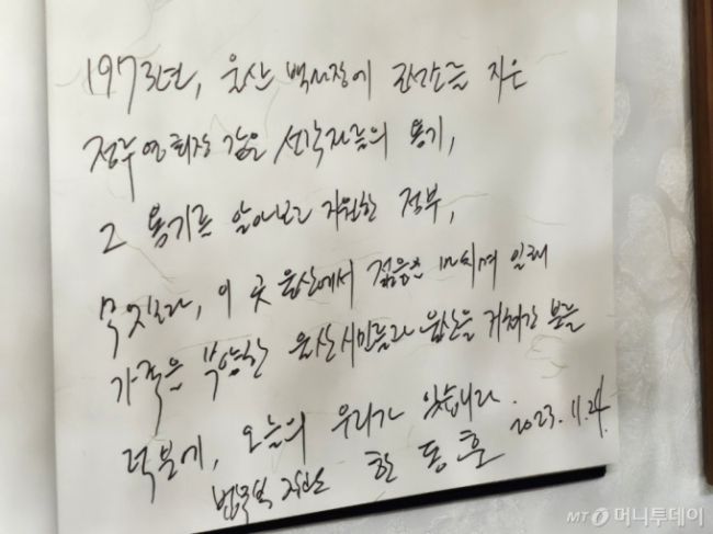 한동훈 법무부 장관이 24일 조선업 관계자 간담회를 위해 울산시 동구 HD현대중공업을 찾아 방명록을 남겼다. /사진=이승주 기자 한동훈 법무부 장관이 24일 오전 조선업 관계자 간담회를 위해 울산시 동구 HD현대중공업을 찾아 방명록을 남겼다. 한 장관은 방명록에 "1973년 울산 백사장에 조선소를 지은 정주영 회장 같은 선각자들의 무용기, 그 용기를 알아보
