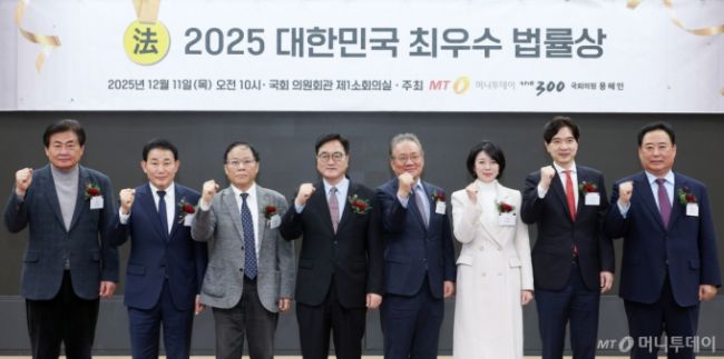 강호병 머니투데이 대표, 우원식 국회의장을 비롯한 수상 의원들이 11일 서울 여의도 국회 의원회관에서 열린 '2025 대한민국 최우수 법률상'에서 기념촬영을 하고 있다. 사진 왼쪽부터 소병훈 더불어민주당 의원, 박용갑 더불어민주당 의원, 채원호 가톨릭대학교 교수, 우원식 국회의장, 강호병 머니투데이 대표, 배현진 국민의힘 의원, 박성훈 국민의힘 의원, 어기
