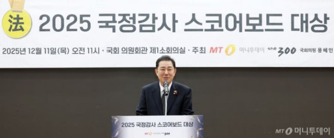 김병기 더불어민주당 원내대표가 11일 서울 여의도 국회 의원회관에서 열린 '2025 국정감사 스코어보드 대상'에서 축사를 하고 있다. 김창현 기자 chmt@mt.co.kr Copyright ⓒ 머니투데이 & mt.co.kr. 무단 전재 및 재배포, AI학습 이용 금지.
