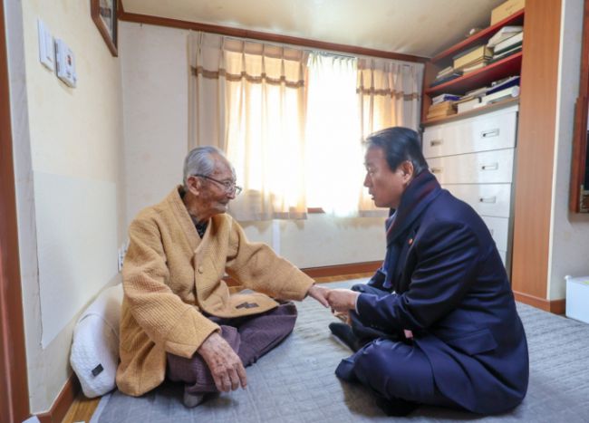[the300] 권오을 국가보훈부 장관(오른쪽)이 12일 제주지역 보훈현장 제주지역 보훈현장 소통 행보를 위해 제주시 서귀포시에 위치한 생존 독립유공자인 강태선 애국지사의 자택을 방문해 위문품을 전달하고 안부인사를 하고 있다. 1990년 건국훈장 애족장을 받은 강 지사는 제주에 거주하는 유일한 생존 애국지사다. /사진제공=국가보훈부 조성준 기자 develo