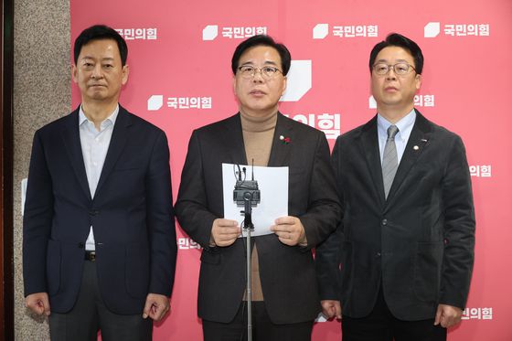 송언석 국민의힘 원내대표(가운데)가 24일 서울 여의도 국회에서 현안 관련 입장 발표를 하고 있다. 송 원내대표는 내란전담재판부 설치법과 정보통신망법 개정안에 대해 “명백한 위헌”이라며 “헌법재판소에 위헌법률심판을 갈 수밖에 없다”고 말했다. [뉴시스] ▶ 중앙일보 / '페이스북' 친구추가 ▶ 넌 뉴스를 찾아봐? 난 뉴스가 찾아와! ⓒ중앙일보(https:/