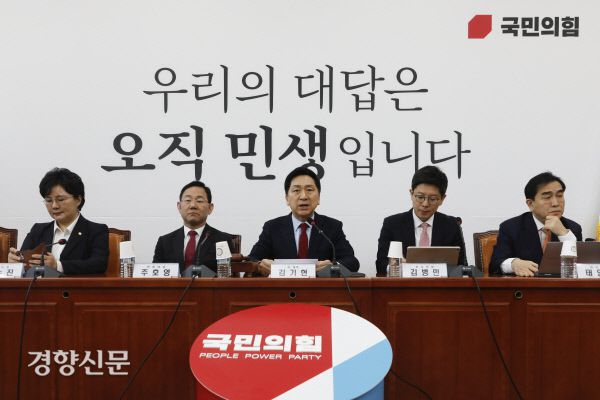 국민의힘 김기현 대표가 27일 국회에서 열린 당 최고위원회의에서 발언하고 있다. 문재원 기자 ▶ 채용부터 성차별, 27년째 OECD 꼴찌 이유 있었다 ▶ 뉴스 남들보다 깊게 보려면? 점선면을 구독하세요 ©경향신문(www.khan.co.kr), 무단전재 및 재배포 금지