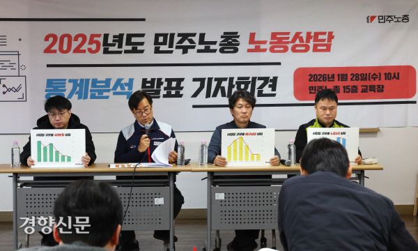 28일 서울 정동 민주노총 교육장에서 열린 ‘민주노총 2025년도 노동상담 통계분석 발표’ 기자회견에서 공성수 민주노총 서울본부 노동법률지원센터 법규국장(노무사·왼쪽 두번째)이 노동상담 통계발표를 하고 있다. 2026.1.28. 정지윤 선임기자 정지윤 선임기자 ▶ 매일 라이브 경향티비, 재밌고 효과빠른 시사 소화제! ▶ 더보기|이 뉴스, 여기서 끝나지 않습