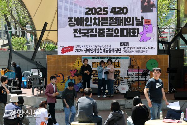 장애인의날인 20일 서울 대학로 마로니에 공원에서 열린 '420장애인차별철폐의날 전국 집중 결의대회'에서 참가자들이 발달장애인의 참정권 보장을 촉구하고 있다. 2025.4.20. 정지윤 선임기자 정지윤 기자 color@kyunghyang.com ▶ 매일 라이브 경향티비, 재밌고 효과빠른 시사 소화제! ▶ 주 3일 10분 뉴스 완전 정복! 내 메일함에 점선면