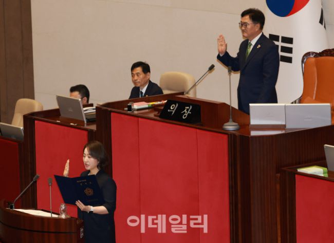 비례대표 의원직을 승계한 이주희 더불어민주당 의원이 4일 서울 여의도 국회에서 열린 제427회국회(임시회) 제3차 본회의에서 의원 선서를 하고 있다.