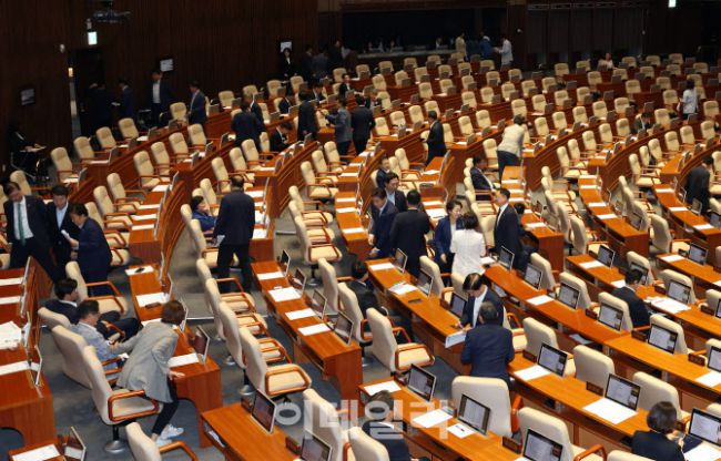 4일 오후 서울 여의도 국회에서 제427회국회(임시회) 제3차 본회의가 열렸다. '방송3법(방송법·방송문화진흥회법·한국교육방송공사법 개정안)' 중 방송법 일부개정법률안이 상정되자 신동욱 국민의힘 의원이 무제한 토론(필리버스터)에 나섰다. 더불어민주당 의원들이 본회의장을 나가고 있다.