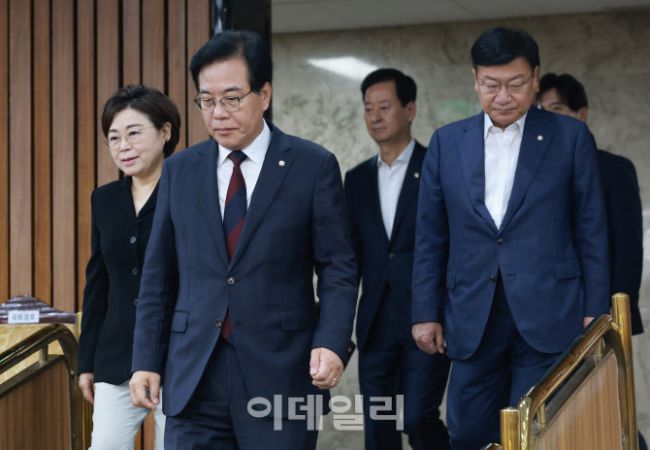 송언석 국민의힘 비상대책위원장 겸 원내대표가 5일 오전 서울 여의도 국회에서 열린 원내대책회의에 참석하고 있다.