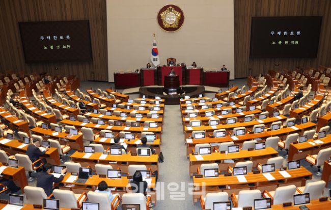 노종면 더불어민주당 의원이 5일 오전 서울 여의도 국회에서 열린 제427회국회(임시회) 제3차 본회의에서 방송3법 찬성 필리버스터(무제한토론)를 하고 있다.