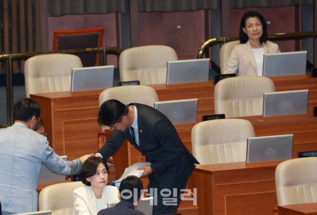 5일 오후 서울 여의도 국회에서 제427회 국회(임시회) 제3차 본회의가 열렸다. 노종면 더불어민주당 의원이 방송법 일부개정법률안(대안)에 대한 무제한토론을 마친 후 의원들과 인사를 하고 있다. 이진숙(오른쪽) 방송통신위원장이 이를 바라보고 있다.