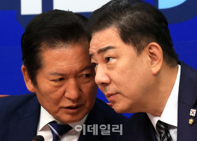 정청래 더불어민주당 대표와 김병기 원내대표가 13일 오전 서울 여의도 국회에서 열린 최고위원회의에서 대화하고 있다.
