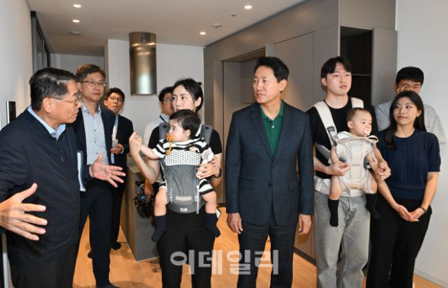 오세훈 서울시장이 13일 서울 송파구 문정동 '비아파트형 미리내집' 르피에드 주거용오피스텔을 방문해 서울 베이비 엠버서더와 함께 관계자의 설명을 듣고 있다.