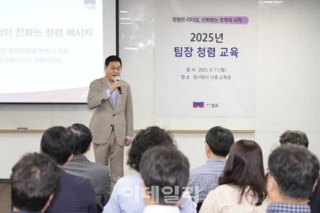 정문헌 종로구청장이 11일 청사 12층 교육장에서 팀장급 직원을 대상으로 청렴 교육을 실시하고 있다. 이번 교육은 공직사회의 청렴성을 강화하고 중간관리자인 팀장들의 청렴 리더십 역량을 높이기 위해 마련됐다. 국민권익위원회 배정애 강사가 ‘청렴은 실천이다’라는 주제로 ▲청렴 실천의 중요성, ▲공무원 행동강령, ▲청탁금지법 및 이해충돌방지법의 이해와 실제 사례