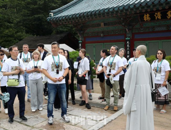 국외 거주 독립유공자 후손들이 14일 서울 은평구 진관사를 방문하고 있다. 국가보훈부는 광복 80주년을 맞아 최재형 선생의 증손을 포함한 미국, 중국, 카자흐스탄 등에 거주하는 후손들을 초청했으며 이들은 15일 광복절경축식에 참석한다.