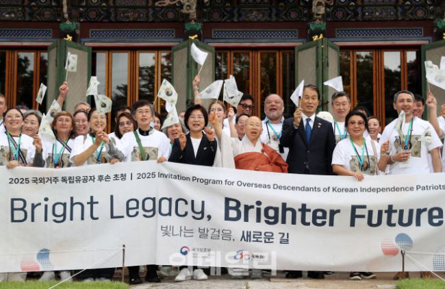 권오을(앞줄 오른쪽 세번째부터) 국가보훈부장관, 법해 진관사 주지스님, 김미경 은평구청장이 14일 서울 은평구 진관사를 방문한 국외 거주 독립유공자 후손들과 기념촬영을 하고 있다. 국가보훈부는 광복 80주년을 맞아 최재형 선생의 증손을 포함한 미국, 중국, 카자흐스탄 등에 거주하는 독립유공자 후손들을 초청했으며 이들은 15일 광복절경축식에 참석한다. 권오을
