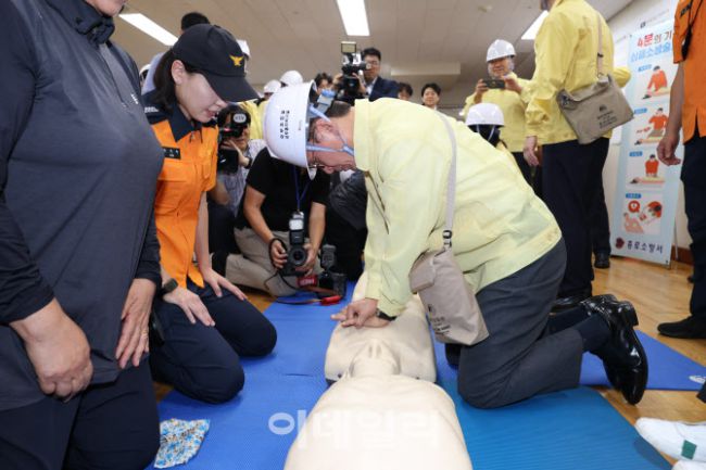 김민석 국무총리가 20일 오후 서울 종로구 정부서울청사에서 열린 을지연습 연계 정부서울청사 공습대비 민방위 훈련에 참석해 심폐소생술 훈련을 하고 있다.