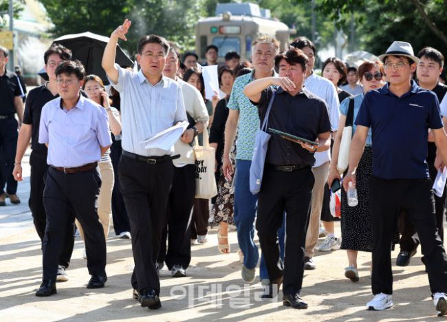 오승록(앞줄 왼쪽 두번째) 노원구청장과 유관부서 관계자들이 19일 ‘2025 노원수제맥주축제(Nowon Beer Festival, NBF)’의 성공적 개최를 위해 현장 합동 점검을 실시하고 있다. 이번 점검에는 구청 전 유관부서가 대대적으로 참여해 ▲축제 이용자들의 동선 파악 및 안전 점검 ▲교통·주차 관리 ▲이용 시설의 편의성 ▲위생·청결 관리 등을 직접