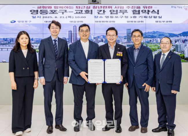 최호권(오른쪽 세번째) 영등포구청장이 21일 영등포구청 기획상황실에서 지역 5개 교회와 ‘퇴근길 청년한끼’ 사업 추진을 위한 업무협약을 체결하고 있다. 이번 협약은 퇴근 후 식사 해결이 어려운 청년을 지원하기 위한 민관 협력 사업으로 협약에는 ▲대광교회 ▲대길교회 ▲대림평화교회 ▲양평동교회 ▲영등포교회가 참여했다. 주요 내용은 청년 맞춤형 요리 프로그램 개