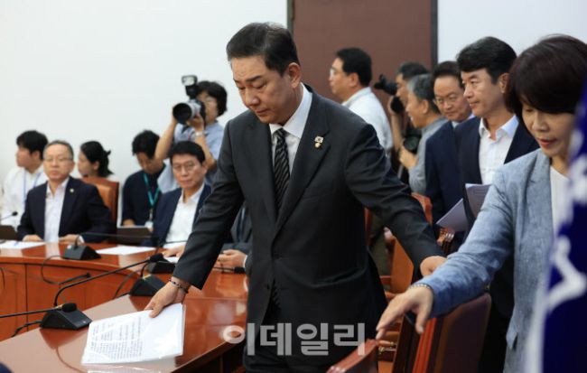 김병기 더불어민주당 원내대표와 한정애 정책위의장 및 원내 지도부가 11일 오전 서울 여의도 국회에서 열린 정책조정회의에 참석하고 있다.