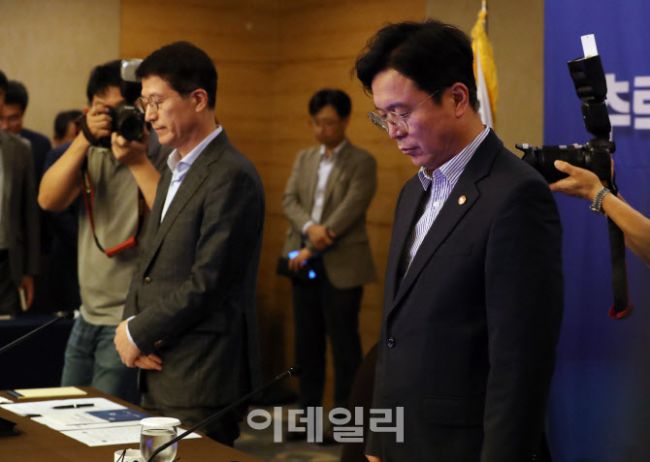 김영훈(오른쪽) 고용노동부 장관이 23일 서울 중구 로얄호텔서울에서 열린 건설사 CEO 간담회에서 희생자를 위한 묵념을 하고 있다. 이날 간담회는 삼성물산, 현대건설 등 20대 건설사 CEO들이 참석한 가운데 추락사고 예방 집중 토의를 진행했다.