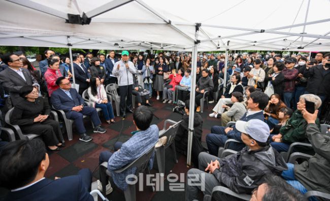 오세훈 서울시장이 13일 서울 강남구 대치동 은마아파트에서 주민 간담회를 하고 있다. 은마아파트는 재건축 정비계획 변경안이 통과돼 재건축 정비사업 속도가 조속히 진행될 예정이다.