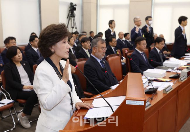 박선영 진실·화해를위한과거사정리위원회 위원장이 14일 서울 여의도 국회에서 열린 행정안전부 등에 대한 행정안전위원회 국정감사에서 증인 선서를 하고 있다.