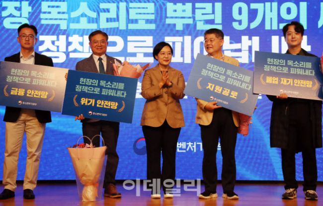 한성숙(가운데) 중소벤처기업부 장관이 15일 서울 상암동 중소기업DMC타워에서 열린 ‘소상공인 회복 및 안전망 강화’를 위한 열 번째 간담회에 참석해 '소상공인의 목소리를 담은 정책' 시상을 하고 있다. 이날 간담회에는 상공인연합회, 전국상인연합회 등 단체장들과 공공기관 및 전문가, 소상공인 등 48명이 참석한 가운데 ‘소상공인 회복 및 재기 지원 방안’을
