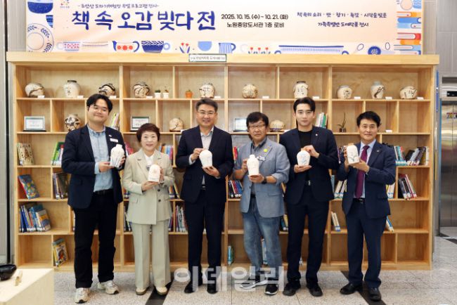 오승록(왼쪽 세번째) 노원구청장이 15일 서울 노원중앙도서관에서 열린 초안산도자기 체험장 구민특별전 ‘책 속 오감 빚다’ 개막식에 참석하고 있다. 이번 전시는 노원구민들에게 도심 속 힐링 명소인 초안산 도자기체험장을 알리고 도예 문화 체험의 기회를 제공하기 위해 마련됐으며 지난 5월부터 9월까지 초안산도자기체험장 가족특별반 프로그램에 참여한 100여 명이