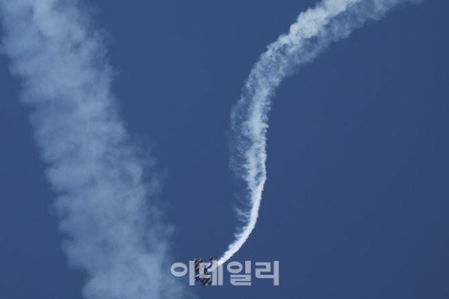 17일 경기도 성남시 서울공항에서 열린 '서울 국제항공우주 및 방위산업 전시회(ADEX)'에서 호주의 민간 곡예 비행팀 폴 베넷이 곡예비행을 선보이고 있다.