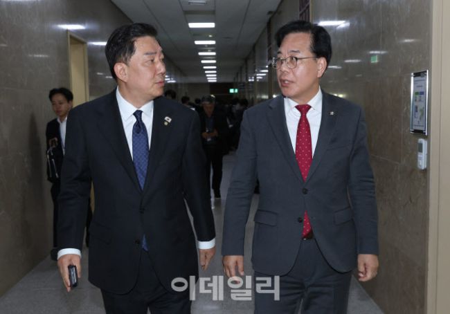 김병기(왼쪽) 더불어민주당 원내대표와 송언석 국민의힘 원내대표가 11일 오후 서울 여의도 국회에서 회동을 마친 후 회의실을 나서며 대화하고 있다.