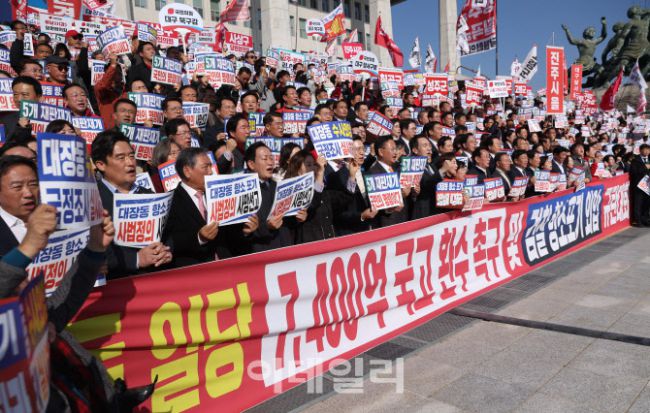 장동혁 국민의힘 당대표와 송언석 원내대표 및 의원들과 참석자들이 12일 서울 여의도 국회 본청 앞에서 열린 대장동 일당 7400억 국고 환수 촉구 및 검찰 항소포기 외압 규탄대회에서 구호를 외치고 있다.