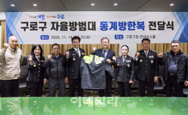 장인홍(오른쪽 네 번째) 구로구청장이 14일 구로구청 르네상스홀에서 열린 ‘자율방범대 동계 방한복 전달식’에서 방범대장들에게 방한복을 전달하고 있다. 지역 치안을 위해 헌신하는 대원들의 노고를 격려한 장인홍 구청장은 “추운 날씨에도 주민 안전을 위해 헌신하고 있는 자율방범대원들께 깊은 감사의 말씀을 드린다”며 “앞으로도 안심하고 생활할 수 있는 구로구를 만