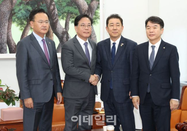 김병기(오른쪽 두 번째) 더불어민주당 원내대표와 송언석(왼쪽 두 번째) 국민의힘 원내대표가 18일 서울 여의도 국회에서 회동하고 있다. 왼쪽부터 유상범 국민의힘 원내운영수석부대표, 송언석 원내대표, 김병기 더불어민주당 원내대표, 문진석 원내운영수석부대표.