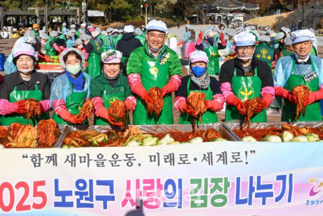 오승록 노원구청장은 21일 중계근린공원에서 열린 노원구 새마을부녀회 ‘2025 사랑의 김장나누기’ 행사에 참석해 김치를 담그고 있다. 지역 내 다문화가정과 저소득 계층 가구에 김장 김치를 지원하기 위해 마련된 '사랑의 김장 나누기 행사'는 새마을부녀회와 협의회 지도자 등 160여 명이 참여해 ▲김장 재료 손질 ▲작업대 배치 ▲김치 담그기 ▲포장 작업 등을