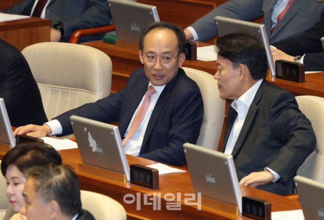 제429회국회(정기회) 제16차 본회의가 9일 오후 서울 여의도 국회 본회의장에서 열렸다. 추경호, 윤한홍 국민의힘 의원이 대화하고 있다.