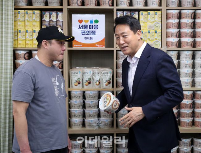 오세훈 서울시장이 17일 오후 관악구 성민종합사회복지관 내 '서울마음편의점'을 방문해 '외로움없는 서울 프로젝트' 1주년 기념 간담회를 갖고 시설을 둘러보고 있다. 서울시가 운영하는 서울마음편의점은 전담콜센터, 오프라인 소통공간, 휴식공간이 있으며 간단한 식음료를 즐길 수 있다. 오세훈 시장은 “우리 사회를 든든히 지탱해 온 중장년층의 외로움에 더욱 귀 기