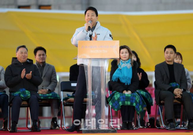 오세훈 서울시장이 19일 오후 서울광장 스케이트장 개장식에서 인사말을 하고 있다. 서울의 명소 서울광장 스케이트장은 내년 2월 8일까지 운영되며 입장료는 지난 2004년 첫 개장이래 변함없이 1,000원이다. 또한, 대기오염도가 나쁘거나 강설의 경우 등 기상 상황에 따라 운영이 중단될 수 있다.